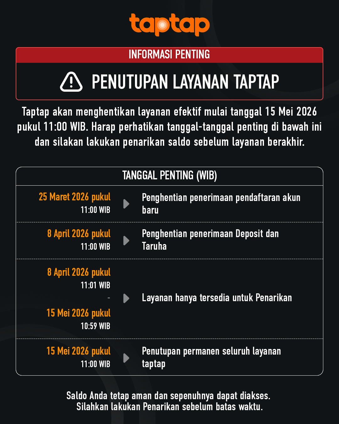 Taptap telah mengumumkan bahwa seluruh layanannya akan resmi dihentikan efektif pada 15 Mei 2026 (12:00 GMT+8). Seiring dengan hal tersebut, seluruh konten terkait dan aktivitas promosi juga akan berakhir.